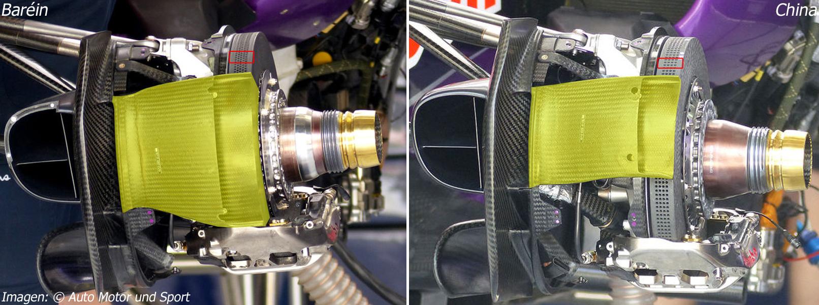 Ne è un esempio la Red Bull, che è intervenuta in diverse aree della RB11 per cercare di migliorare la (complicatissima…) situazione in cui versa il team austriaco in questa prima parte di campionato. I tecnici sono intervenuti sui freni anteriori con una conduttura maggiorata (FOTO) ed hanno applicato un piccolo flap a sbalzo nella parte esterna della paratia della nuova ala anteriore introdotta in Cina (FOTO).